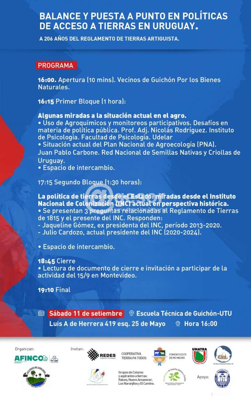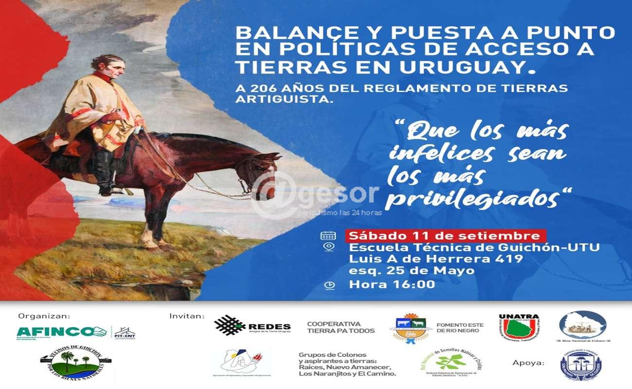La Asociación de Funcionarios del Instituto Nacional de Colonización, y Colectivo Guichón por los Bienes Naturales realizan una charla, este sábado 11 de setiembre, a 206 años del Reglamento de Tierras impulsada por José Gervasio Artigas. La actividad comenzará a las 16 horas, interviniendo varios panelistas.