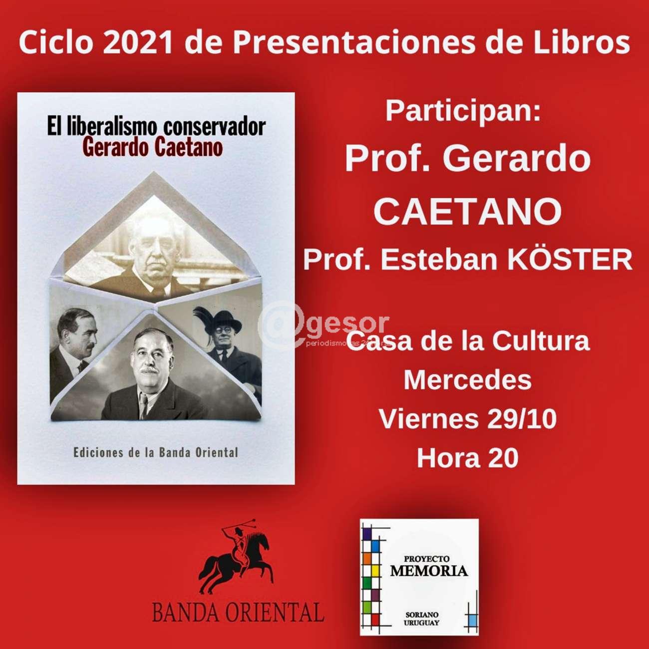 Este viernes, con la organización de la Comisión Memoria, Justicia y contra la Impunidad, en el anfiteatro de Casa de la Cultura de Mercedes, estará presentándose el libro "El Liberalismo Conservador" para lo cual llega su autor Prof. Gerardo Caetano que expondrá sobre ello y estará también haciendo la presentación el Prof. Esteban Köster.