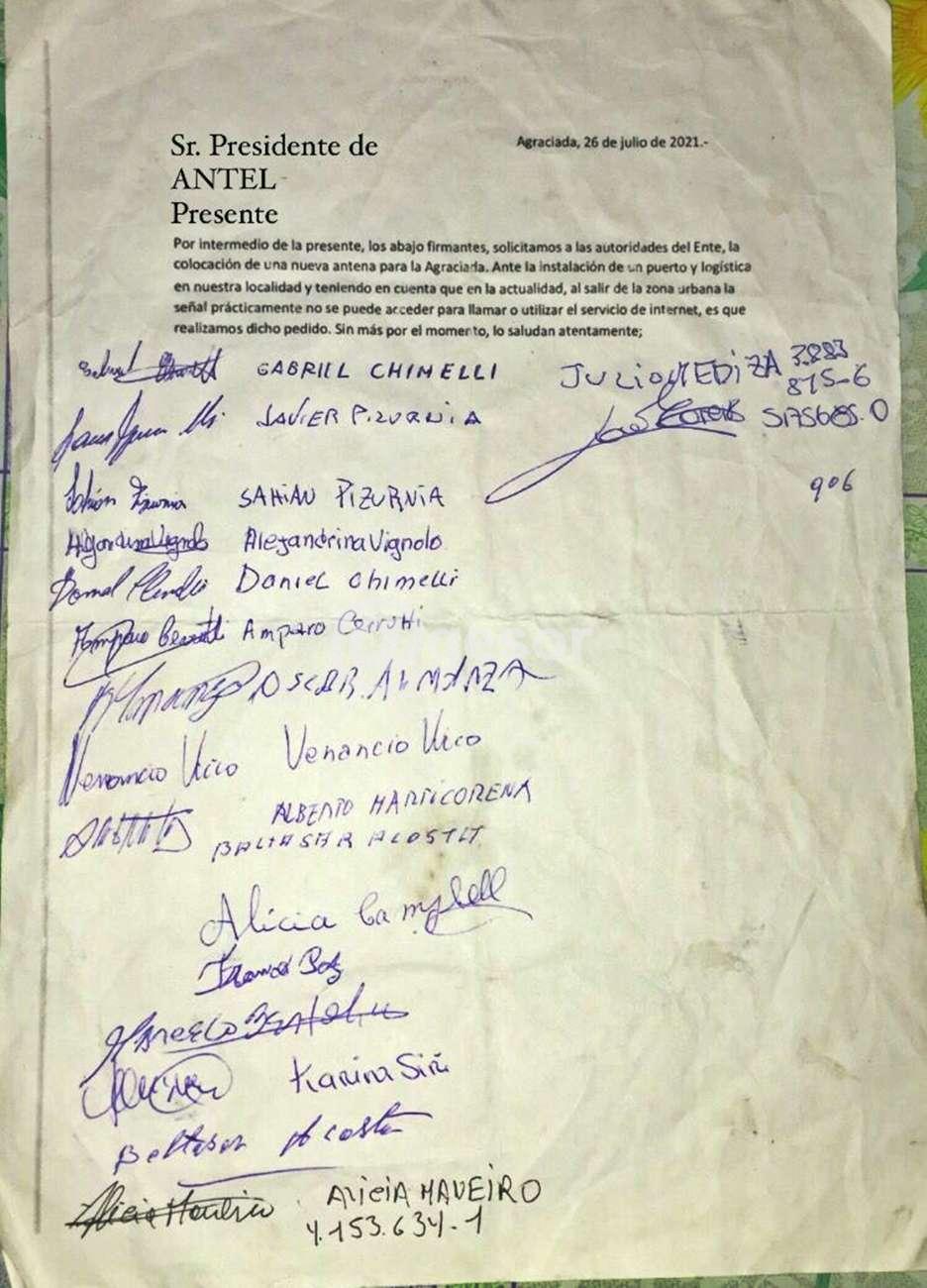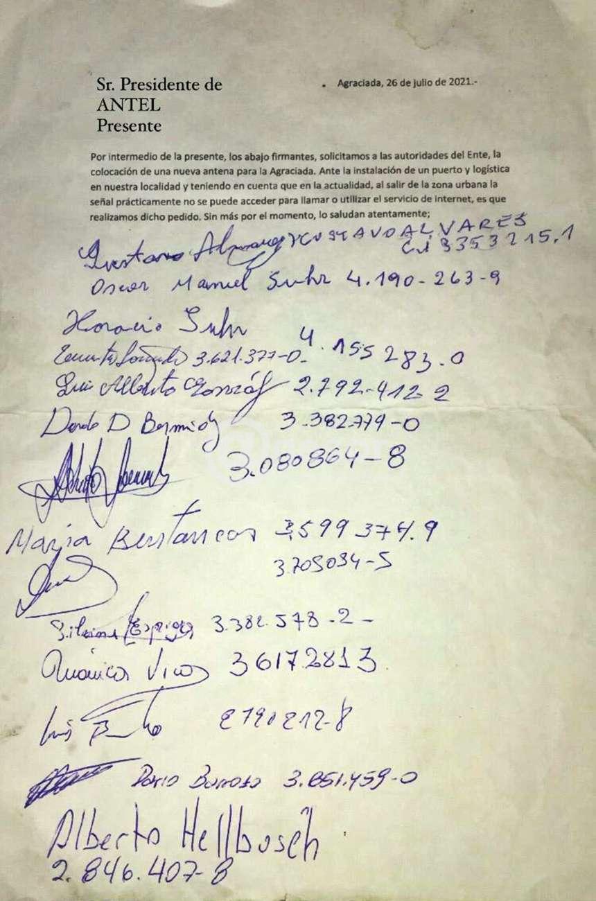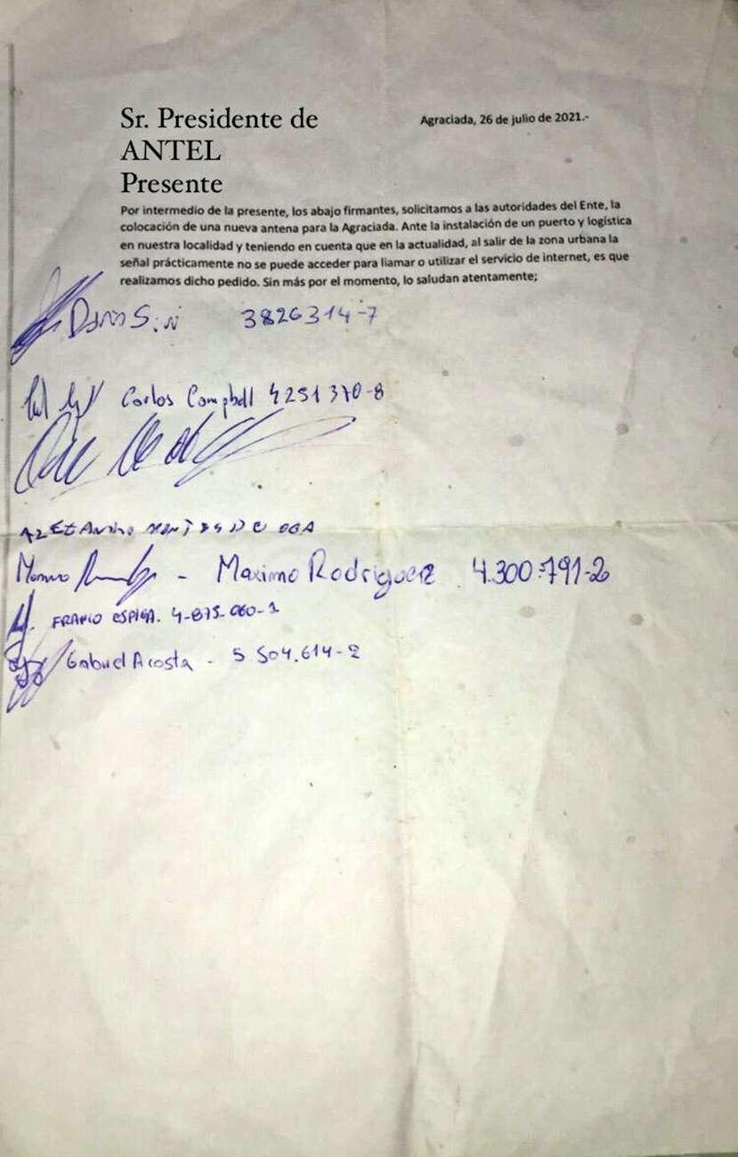 Este viernes hicimos llegar y acompañamos con envío de mail a Presidencia de ANTEL, de la recolección de firmas de la localidad de Agraciada para la colocación de una antena en la localidad.