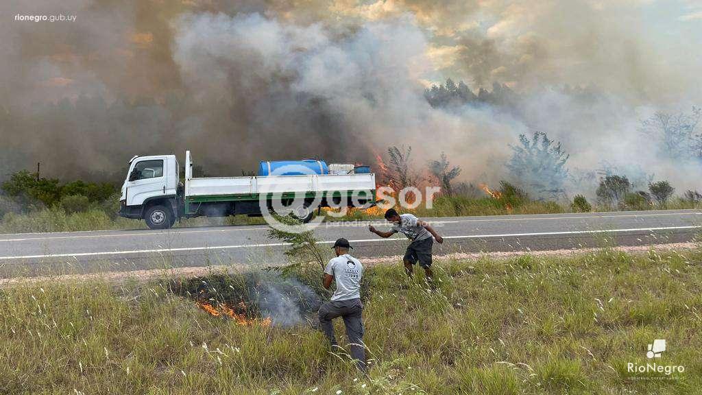 En el lugar trabajan efectivos de bomberos de la ciudad de Young y Guichón, personal de las forestales con la intervención de maquinarias y se contó además con la inmediata colaboración de funcionarios municipales aportando un topador, una retro y camión con cisterna.