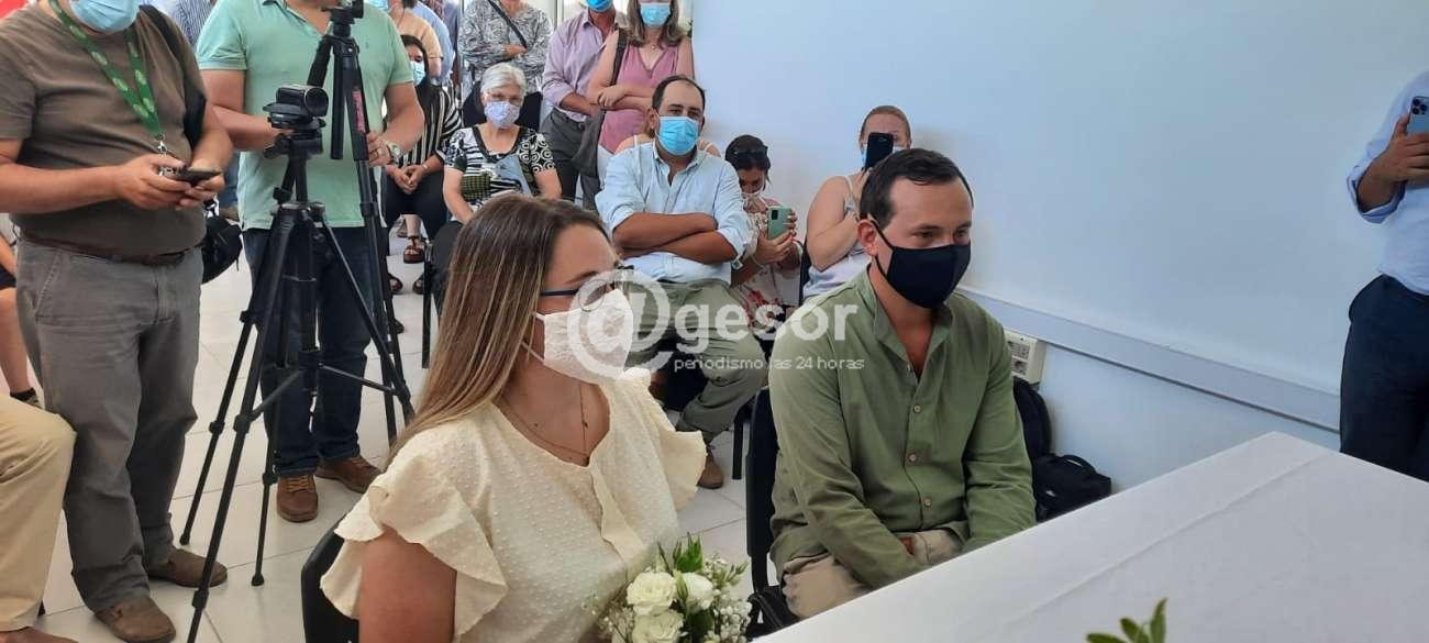 La ceremonia se desarrolló en las instalaciones de Casa Fértil donde funciona la oficina que lleva adelante este tipo de trámites y contó con la presencia del Intendente (i) de Soriano Esc. Daniel Gastán, también el Dr. Andrés Ramírez Maizonaba que ess el Oficial de Registro de Estado Civil de Mercedes, pero que a su vez coordina las actividades con los cuatro municipios que tiene Soriano, además de familiares de los novios y otras autoridades.