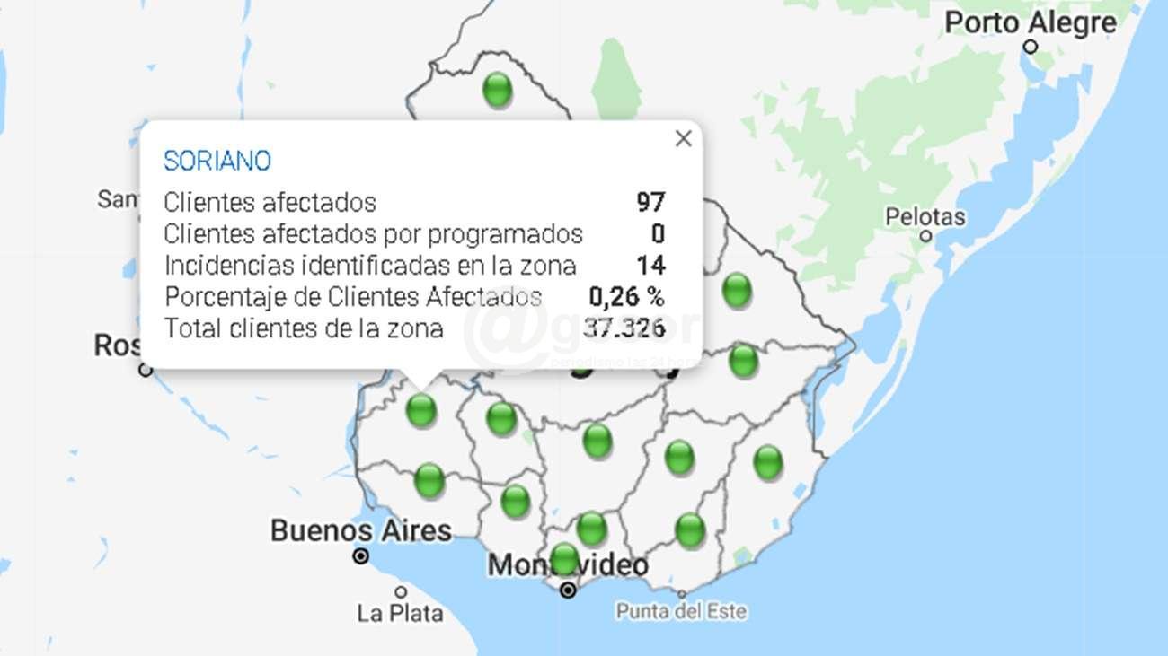 UTE  informa que a esta hora son 97 los usuarios afectados por corte de energía eléctrica, lo que representa el 0,26%  de los  37.326 clientes del departamento.