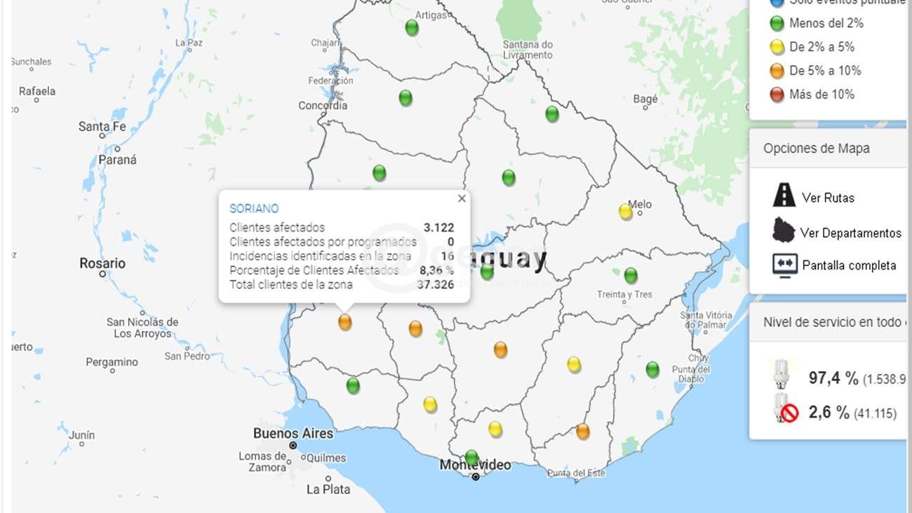 UTE informa que  producto de esta situación climática  el 8,36% de sus clientes en Soriano han visto afectado el suministro de energía electrica, realizándose trabajos para reponerles el servicio. Calificando como una incidencia de gran porte el corte de energía que se registró en ruta 2,  en la zona de Palmitas, donde  1.216 usuarios sufrieron corte.  El otro punto del departamento  que experimentó un corte importante fue la zona de Risso y Egaña donde el organismo detectó que  1.040 usuarios se quedaron sis servicio. En el caso de Palmitas por los trabajos emprendidos se preveía que el servicio se reestableciera sobre las  22 horas de esta sábado en tanto en la zona de Risso y Egaña el servicio podría ser reestablecerce sobre la medianoche.