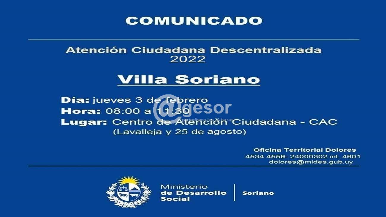 A partir de las 8 horas y hasta las 11,30 personal de MIDES estará atendiendo las consultas de los vecinos de Villa Soriano. Será en el Centro de Atención Ciudadana (CAC), calle Lavalleja y 25 de agosto.