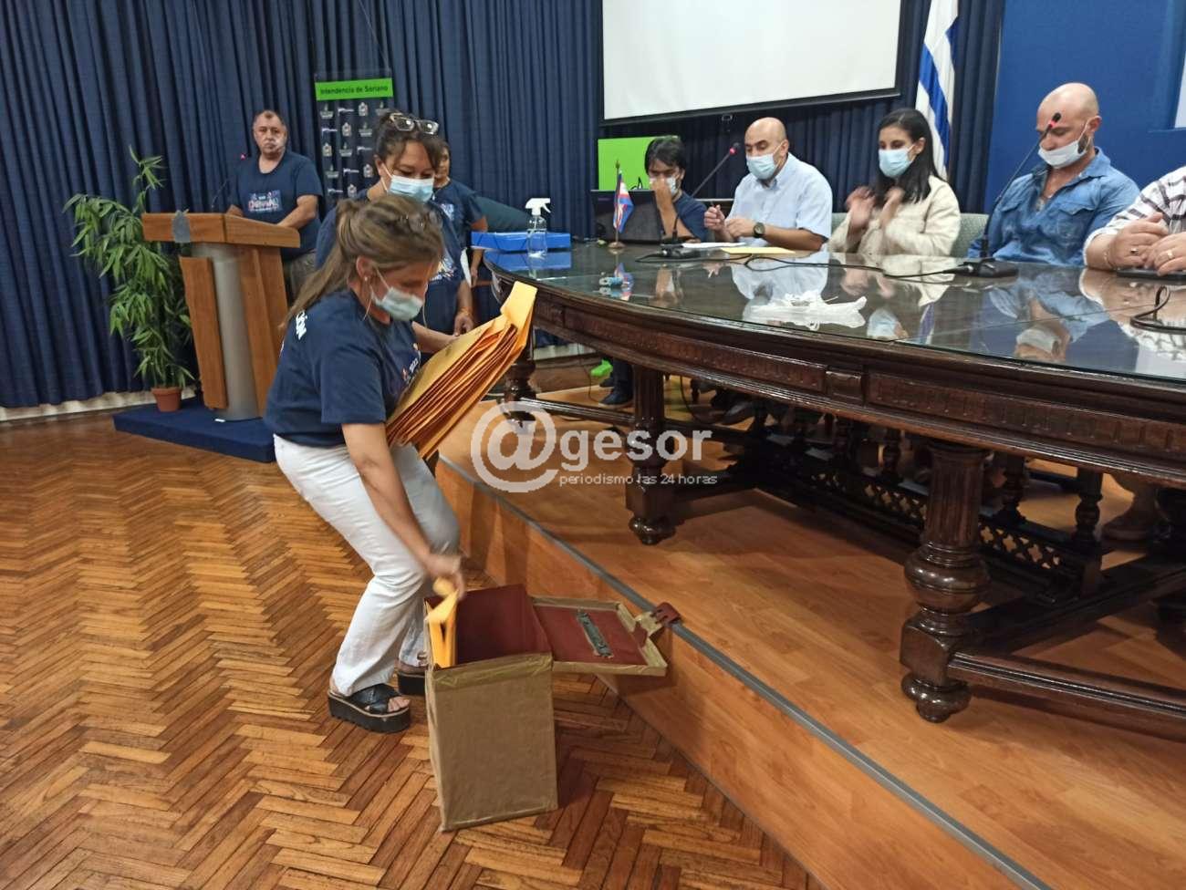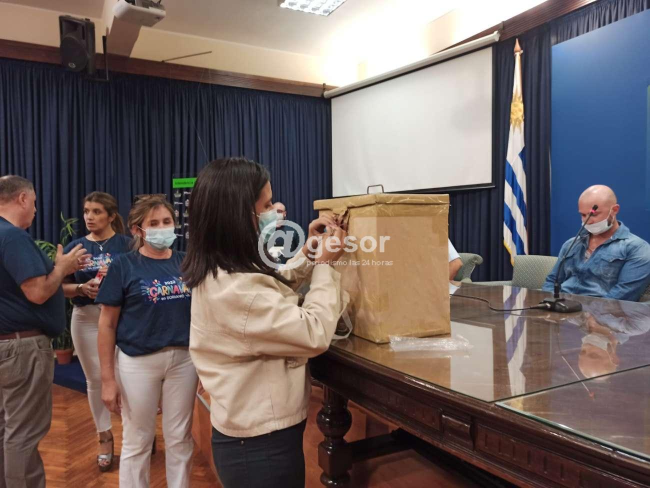En salón de actos ¨Eduardo Víctor Haedo¨ de la Intendencia de Soriano se abrieron los sobres conteniendo las planillas de cada Jurado del Concurso Departamental de Agrupaciones de Carnaval de Soriano, con la presencia del Director de Cultura de la comuna, Lic. Javier Utermark, Lourdes Cerchi exDirectora de Cultura y colaboradora este año del Carnaval, el Jurado integrado por Jonathan Más, Nilda Costa, Ricardo Hann, Uriel Moreira y Gisella Giménez, los presentadores oficiales del Carnaval José María Romero y Silvana Martínez, integrantes del equipo de Coordinación del Carnaval encabezado por Andrea Dibble, junto a Federico Chick y Graciela Osores, todo supervisado por el Esc. Joaquín Alvarez de la División Notarial de la comuna para fiscalizar la apertura de la urna y lectura de las planillas de cada jurado y la suma de cada rubro para determinar el resultado final por categoría, y redactar el acta correspondiente. En sala también los directores responsables o representantes de cada una de las agrupaciones que participaron en el concurso.