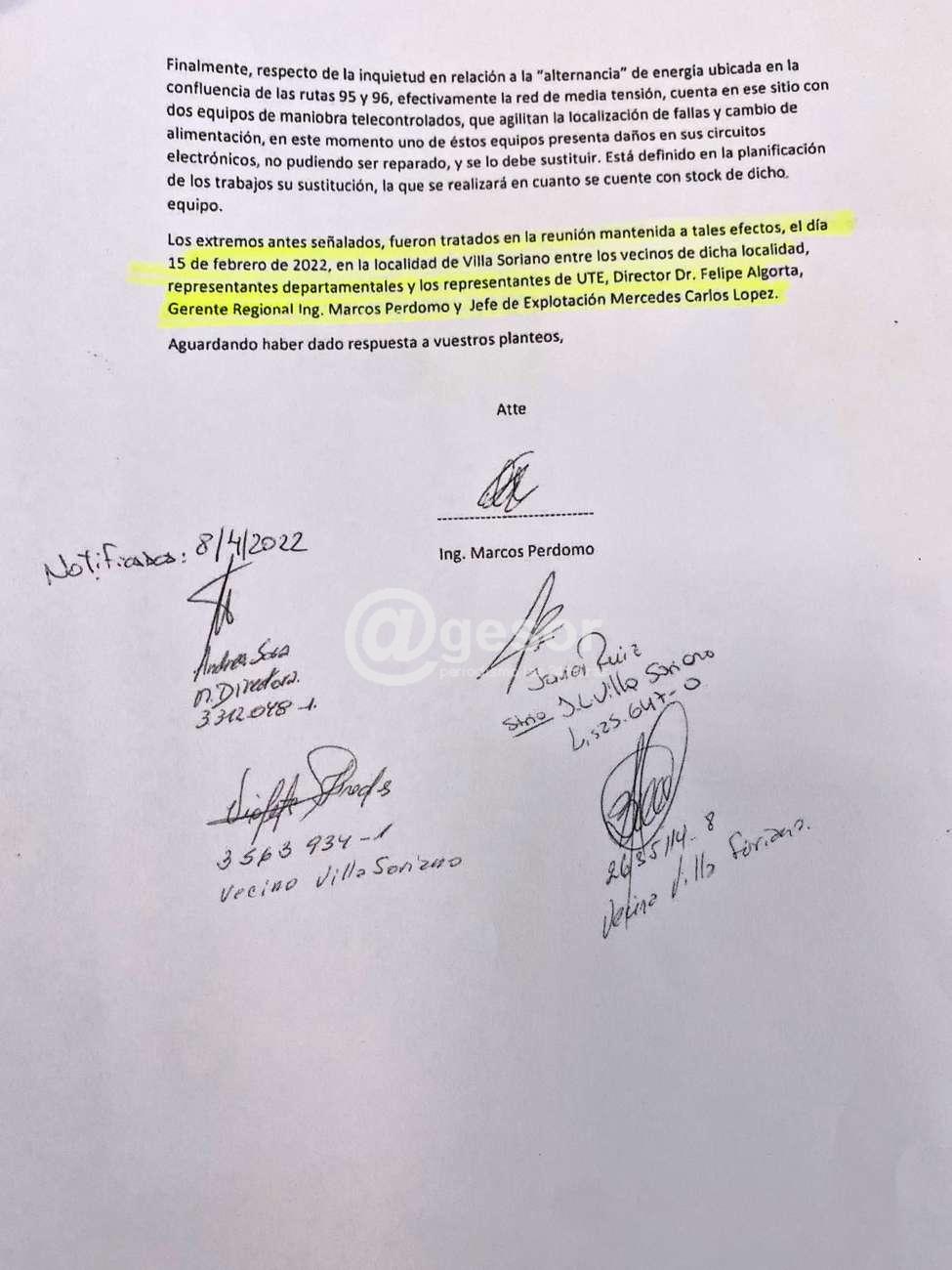 Ediles José Lavista y Luciano Andriolo agradecen públicamente al Director de UTE, Felipe Algorta "que luego de la públicación que realizáramos en las últimas horas, nos hizo llegar esta carta con avances luego de la reunión con vecinos de Villa Soriano, también adelantar que con respecto al tema de las mejores de señales de antena cuando hay cortes de luz, ya hay un plan que hicieron con el Ing. Gabriel Gurméndez, Presidente de ANTEL y el Directorio de UTE, de independencia del abastecimiento de energía para las antenas cuando hay cortes de luz".
