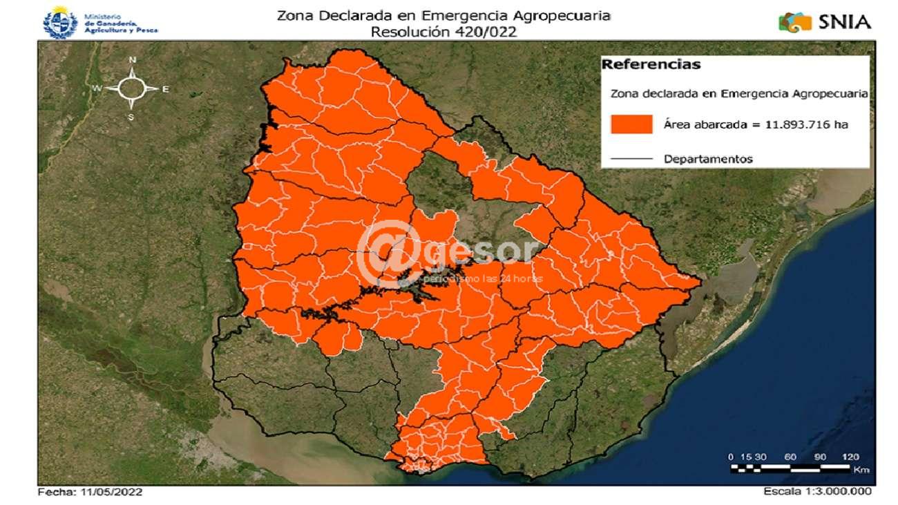 La declaración comprende los departamentos y seccionales policiales alcanzados por la declaración de emergencia agropecuaria efectuada por Resoluciones ministeriales Nos. 1840/021 y 1841/021, ambas de 30 de diciembre de 2021, Nº 01/022, de 3 de enero de 2022, Nº 022/022, de 5 de enero de 2022, Nº 020/022, de 17 de enero de 2022 y Nº 118/022, de 4 de febrero de 2022, y rige por el plazo de 90 días.
