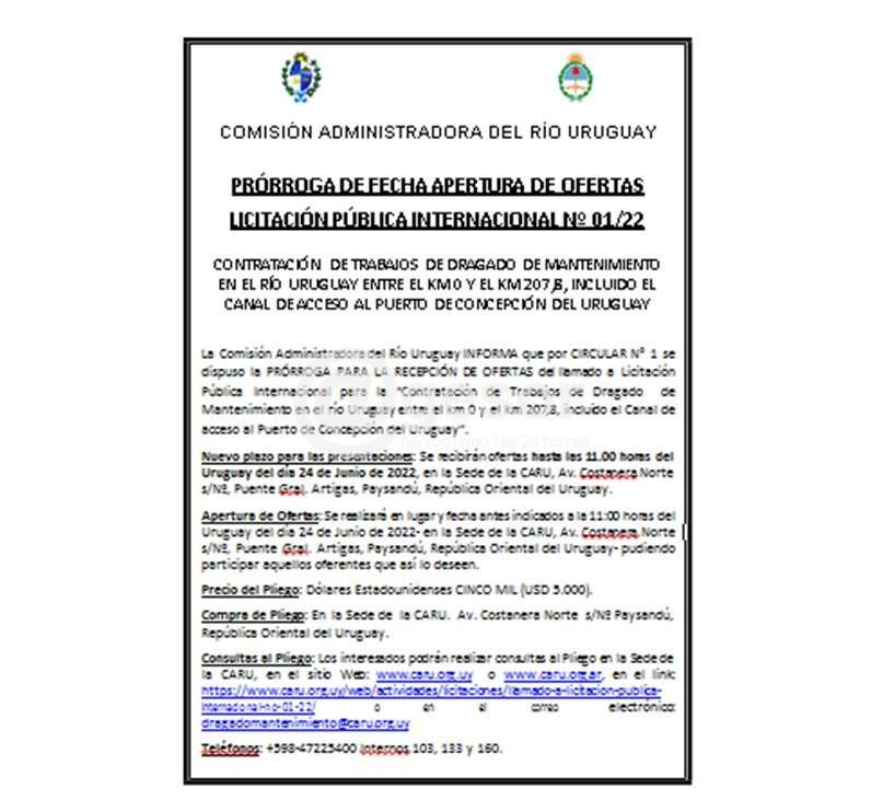 La Comisión Administradora del Río Uruguay INFORMA que por CIRCULAR N° 1 se dispuso la PRÓRROGA PARA LA RECEPCIÓN DE OFERTAS del llamado a Licitación Pública Internacional para la “Contratación de Trabajos de Dragado de Mantenimiento en el río Uruguay entre el km 0 y el km 207,8, incluido el Canal de acceso al Puerto de Concepción del Uruguay”.