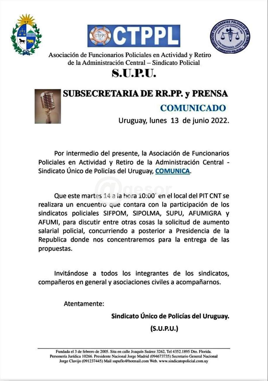 Uno de los sindicatos policiales, el SUPU, hizo llegar a @gesor comunicado en el que informa: "Este martes a las 10.00 horas en la sede del PIT CNT se realizá un encuentro que contará con la participará de los sindicatos policiales SIFPOM, SIPOLMA, SUPU, AFUMIGRA y AFUMI, "para discutir entre otras cosas la solicitud de aumento salarial policial, concurriendo a pasteriori a Presidencia de la República donde nos concentraremos para la entrega de las propuestas.