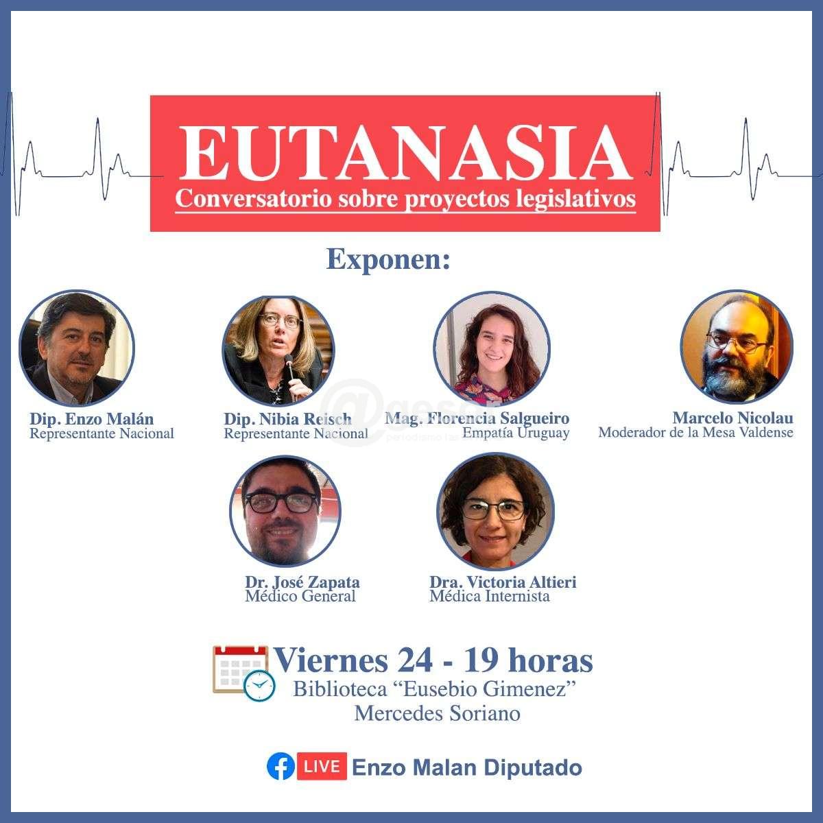 El viernes 24 de junio en sala de conferencias de Biblioteca Eusebio Giménez se realizará un Conversatorio sobre Eutanasia. Como se sabe el Parlamento viene evaluando un proyecto de Ley sobre el tema, por lo que en este conversatorio que se realizará en Mercedes participarán los diputados Nibia Reisch ( Partido Colorado), Enzo Malán (Frente Amplio), Mag. Florencia Salgueiro (Empatía Uruguay), Marcelo Nicolau (Moderador de la Mesa Valdense), Dr. Jorge Zapata (Médico genral) y Dra. Victoria Altieri (Medicina internista) .
