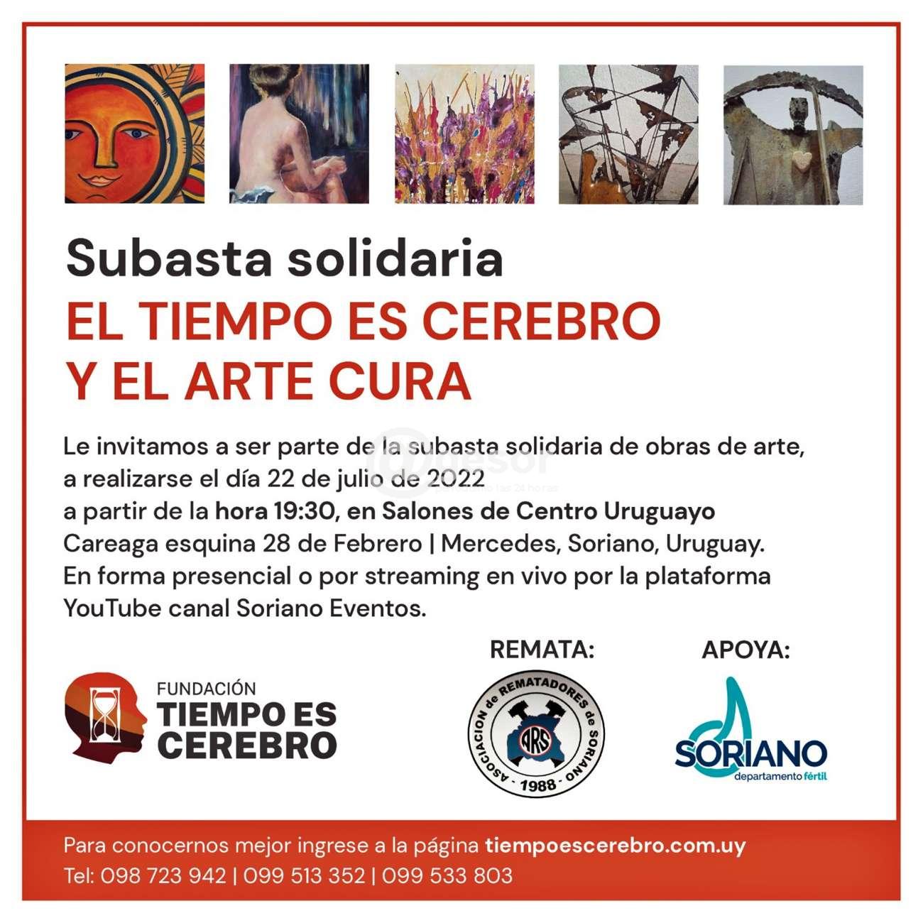 Este viernes 22 de julio desde las 19.30 horas en salones del Centro Uruguayo ubicado en de Castro y Careaga esquina 28 de Febrero en Mercedes, con la organización de la Fundación "Tiempo es Cerebro", el apoyo de la Intendencia de Soriano y de la Asociación de Rematadores de Soriano, se llevará a cabo subasta solidaria titulada "El tiempo es cerebro y el arte cura".