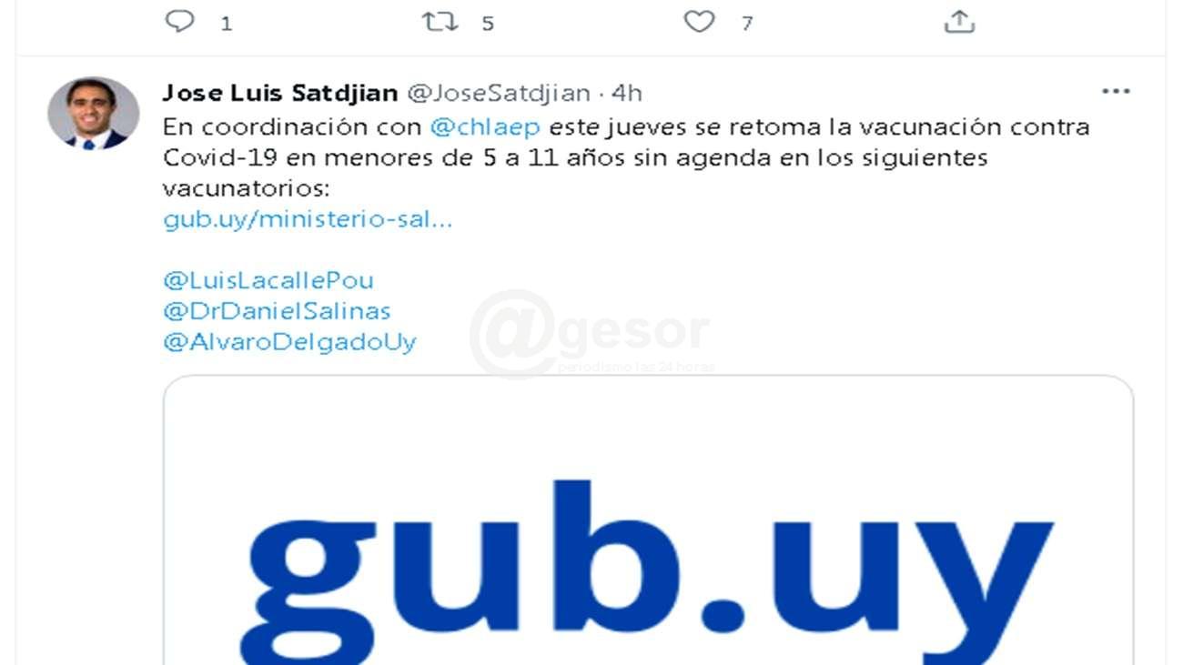 Este jueves se retomará la vacunación contra el Covid-19 a niños de entre 5 y 11 años. Será una vacunación sin agenda previa, tal lo que anunció el subsecretario del Ministerio de Salud Pública, José Luis Satdjian en su cuenta de twitter: En coordinación con @chlaep este jueves se retoma la vacunación contra Covid-19 en menores de 5 a 11 años sin agenda en los siguientes vacunatorios Listado de vacunatorios