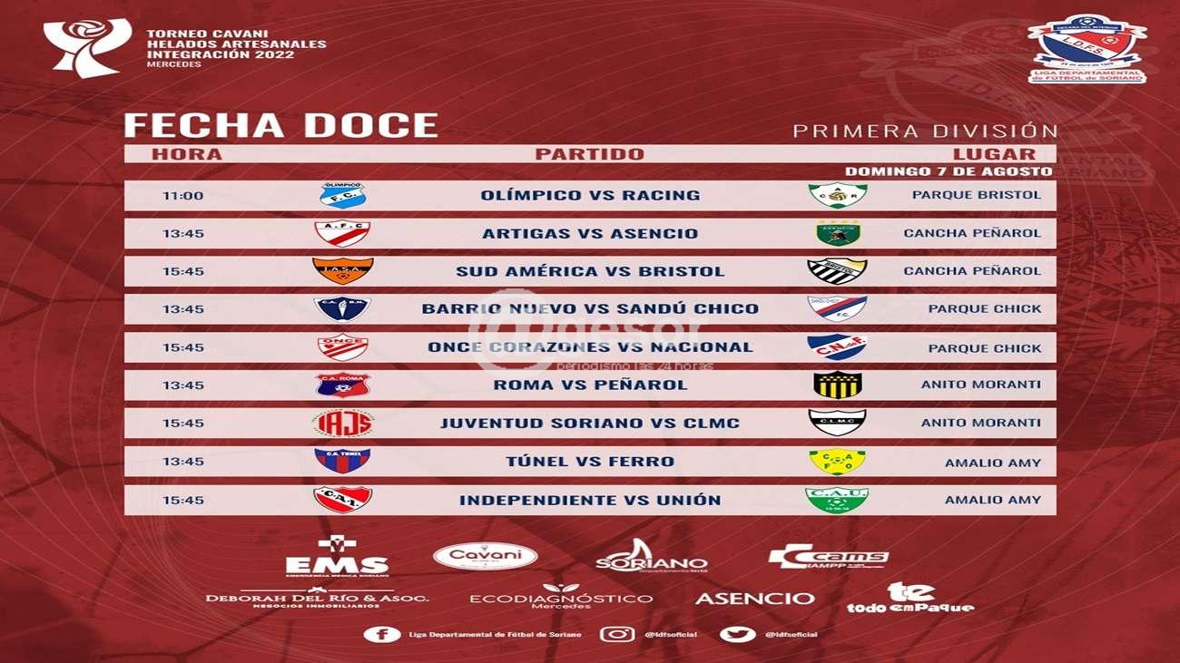 Reunido el Consejo Directivo de la Liga Departamental de Fútbol de Soriano bajo la presidencia del Dr. Pablo Marrero  fijó  los detalles de la  fecha número 12  del Torneo Integración con los siguientes partidos:  hora 11 y para la TV juegan el partido de la fecha, Olímpico vs Racing en cancha de Bristol. En cancha de Peñarol hora 13 y 45  juegan Artigas vs Asencio, y a segunda hora 15 y 45 Sud América vs Bristol. En parque Chick juegan a primera hora Barrio Nuevo vs Sandú Chico y a segunda hora Once Corazones vs Nacional. En el Anito Moranti a la hora 13 y 45 juegan Roma vs Peñarol y a segunda hora 15 y 45 juegan Juventud Soriano vs CLMC. Mientras que en el Amy juegan Túnel vs Ferro a primera hora y a segunda hora Independiente vs Unión.