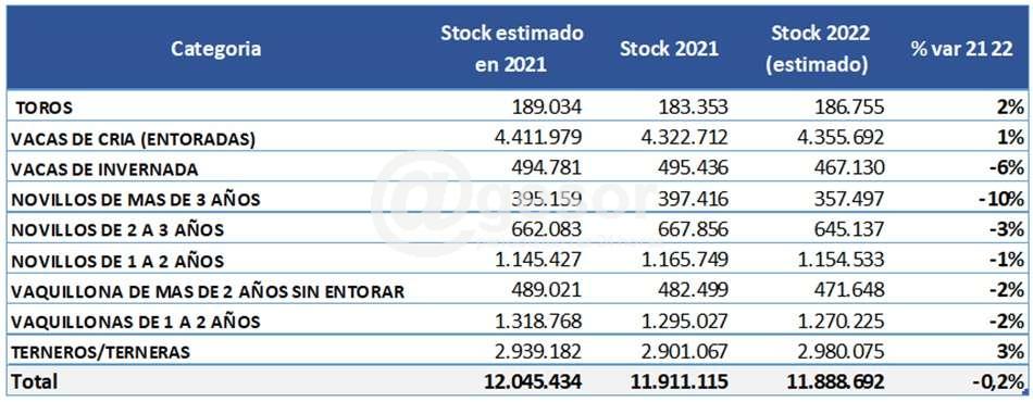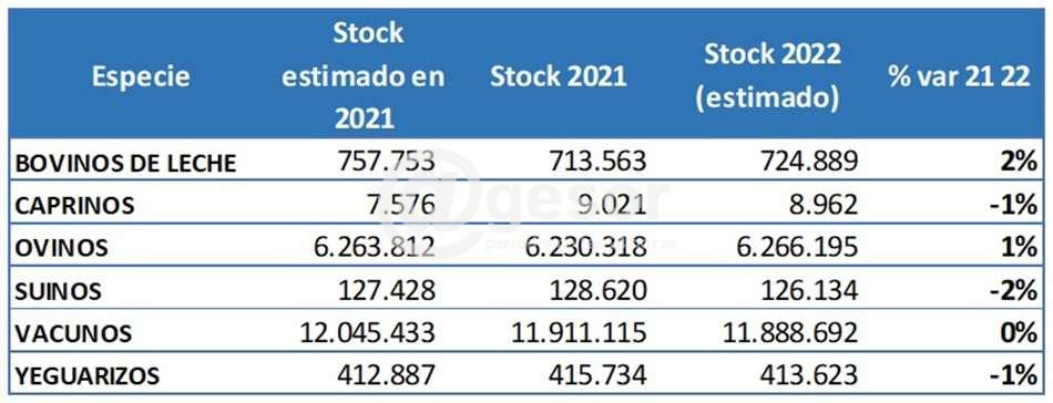 Según las estimaciones hechas sobre la cantidad de explotaciones, la cantidad de animales vacunos en el país disminuye levemente y se ubicaría en un stock cercano a 11,9 millones de vacunos. Por otro lado, se estima una variación positiva en el stock de bovinos de leche (2 %) y ovinos (1 %) y una caída de la cantidad de animales de otras especies, especialmente en suinos (-2 %).