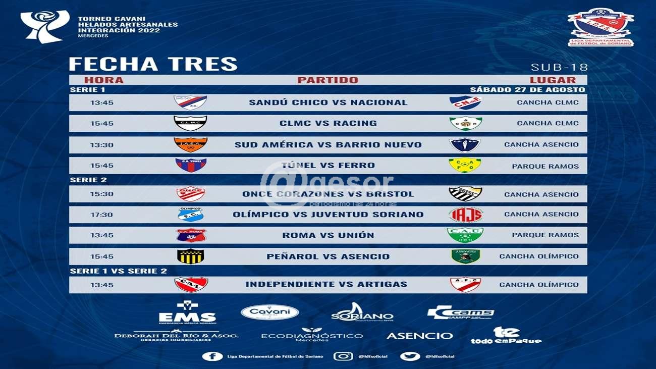 Se fijó una nueva fecha, la tercera del torneo con los siguientes partidos, todos el sábado, hora 13 y 45 juegan Sandú vs Nacional y 15 y 45 CLMC vs Racing en cancha de CLMC. Sud América vs Barrio Nuevo hora 13 y 30, mientras que hora 15 y 30 juegan Once Corazones vs Bristol y a las 17 y 30 Olímpico vs Juventud Soriano todos en cancha de Asencio. Juegan en Parque Ramos, a las 13 y 45 Roma vs Unión y a las 15 y 45 Túnel vs Ferro. En cancha de Olímpico Independiente vs Artigas hora 13 y 45.