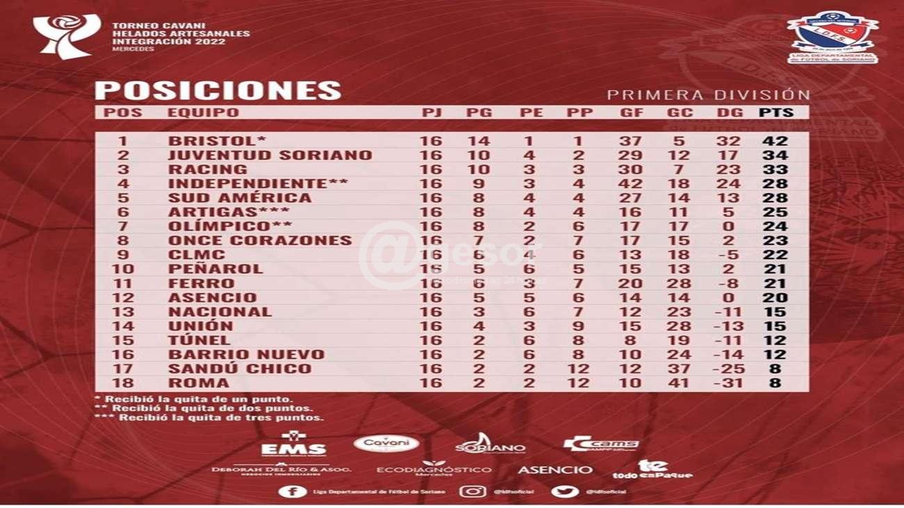 El campeón anticipado, Bristol llegó a los 42 puntos en la tabla, seguido por Juventud Soriano con 34, Racing con 33, Independiente y Sud América con 28.