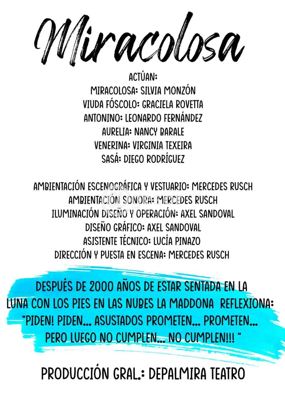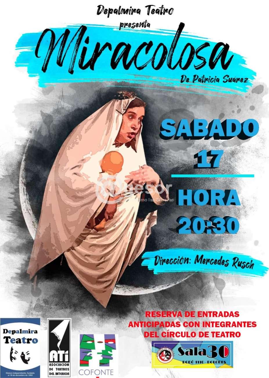 Depalmira Teatro se presenta este sábado 17 de setiembre en Sala 30 (Rodó 1110, Dolores) con la obra “Miracolosa”. Dirigidos por Mercedes Rusch este grupo teatral del departamento de Colonia viene presentando esta obra en diferentes salas. Un espectáculo que cuenta con el respaldo de la Asociación de Teatros del Interior, y Cofonte (Comisión del Fondo Nacional de Teatro).