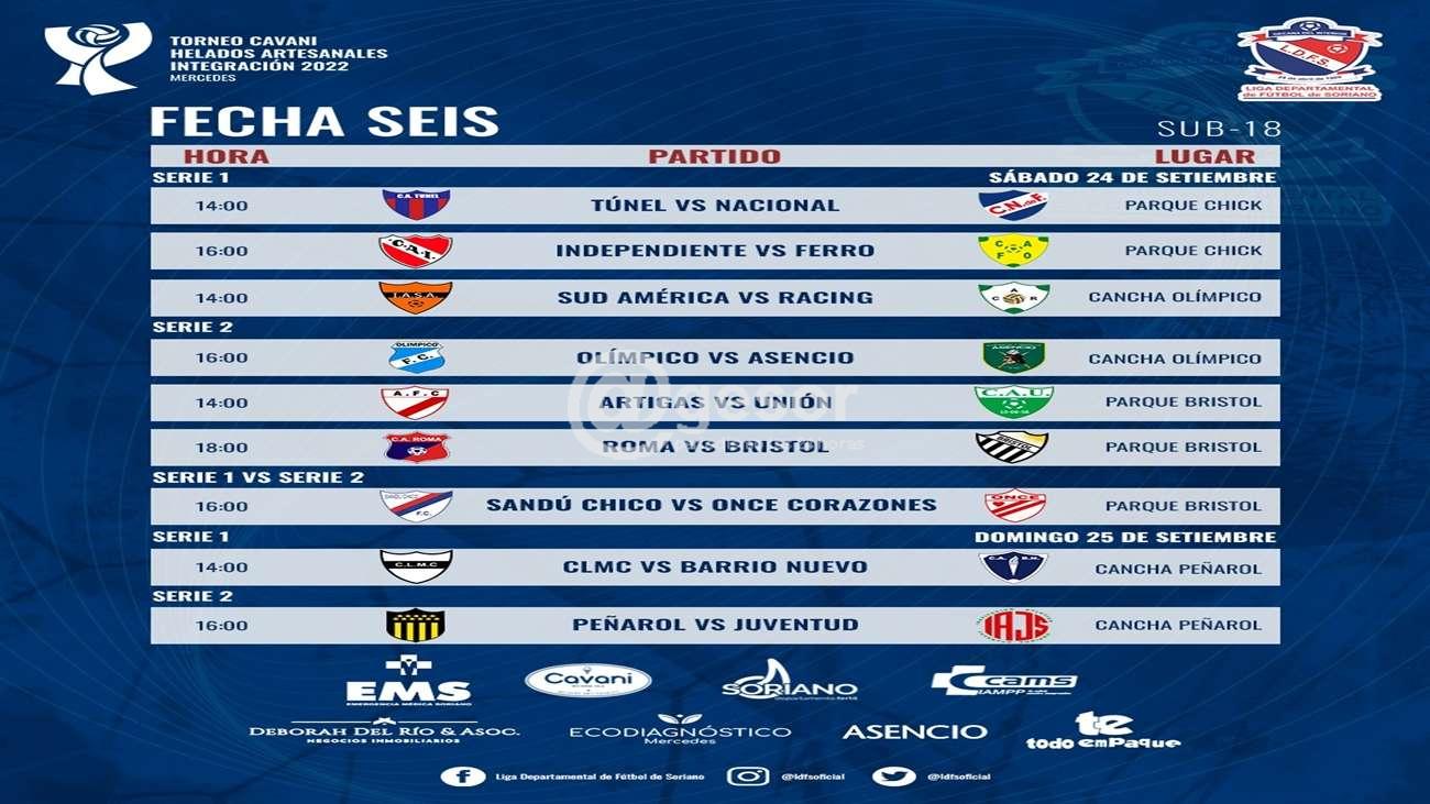 Nueve partidos componen la sexta fecha del Torneo integración de la categoría Sub 18 del fútbol mercedario. Se disputarán en Parque Chick, Cancha de Olímpico, Parque Bristol, y Cancha de Peñarol entre el sábado y el domingo.