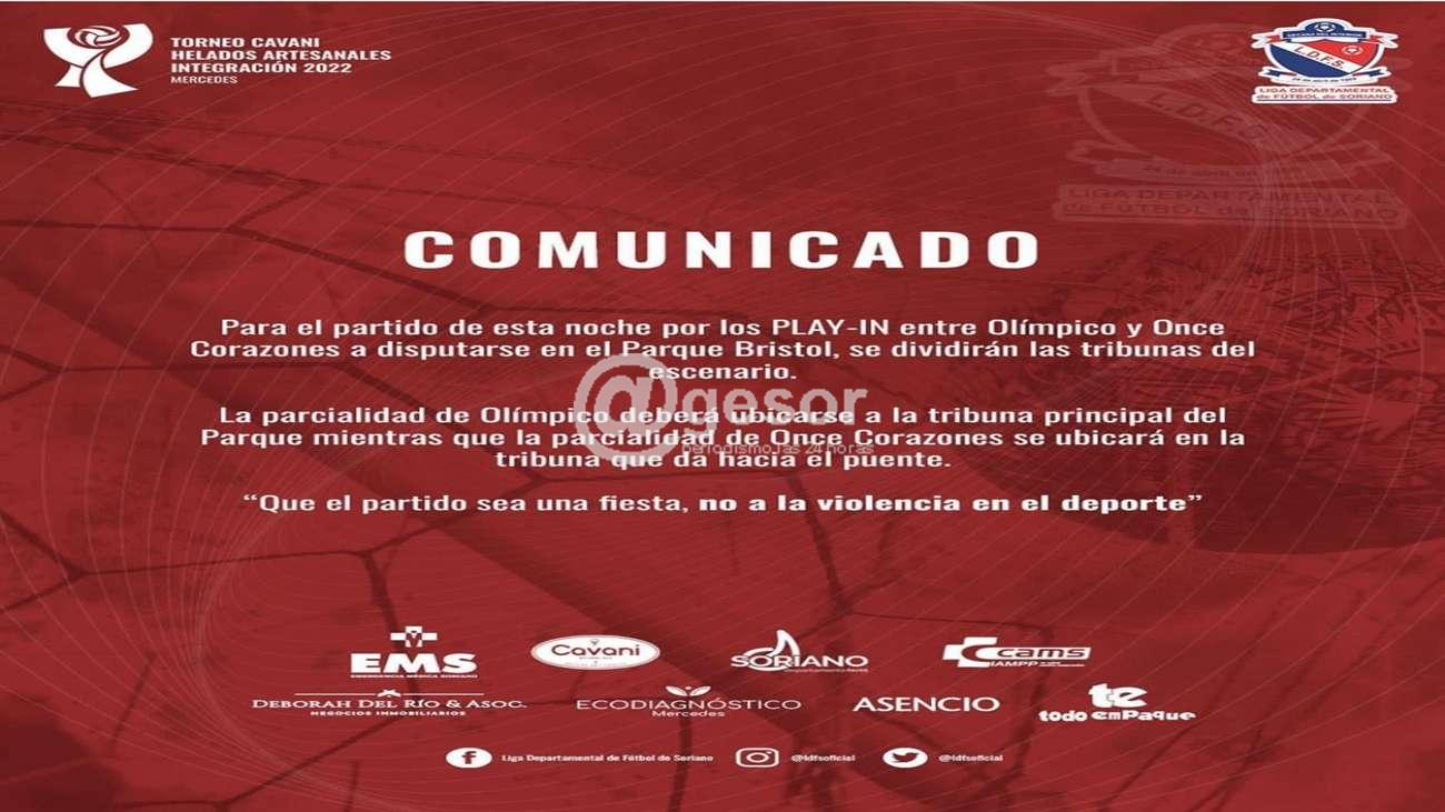 “Para el partido de esta noche por los Play-in entre Olímpico y Once Corazones a disputarse en el Parque Bristol, se dividránlas tribunas del escenario.