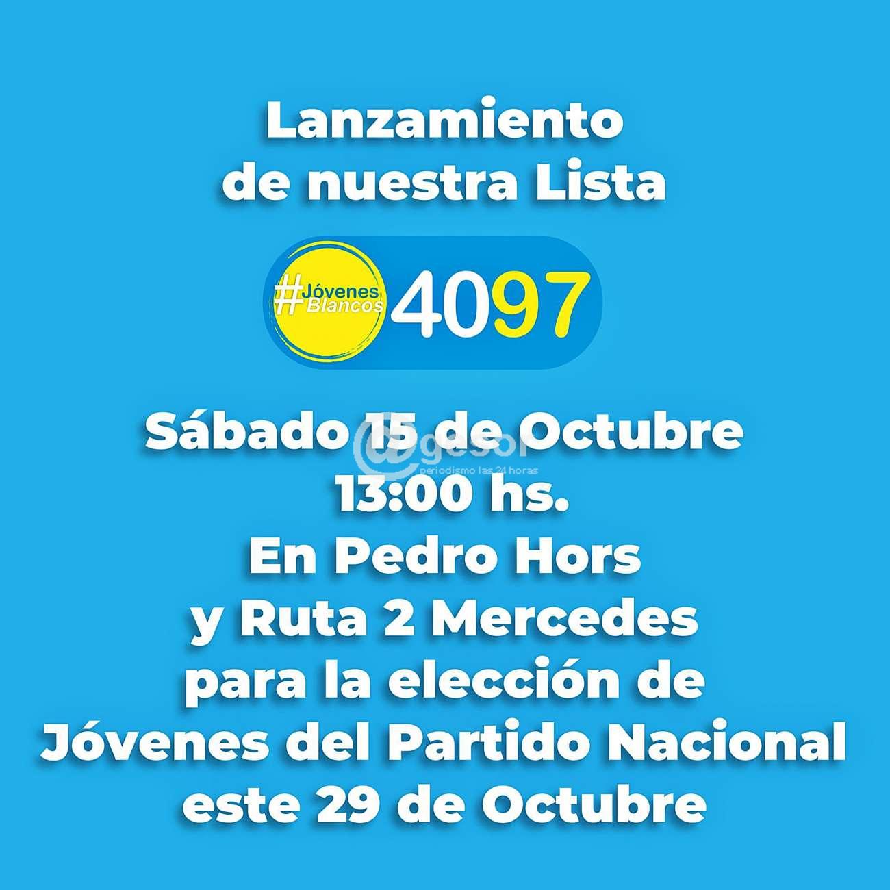 Este sábado 15 a las 13.00 horas se lleva a cabo el lanzamiento de la Lista 4097 para Elección de Jóvenes del Partido Nacional, en el local ubicado en Pedro Hors y Ruta 2 de Mercedes.
