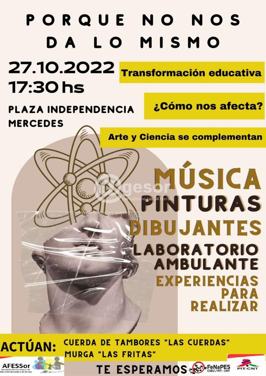 Será este jueves 27 de octubre, a las 17 horas, en Plaza Independencia de Mercedes, con una movida en Música, Pintura, Dibujo, Laboratorio ambulante y experiencias para realizar, porque “Arte y Ciencia se complementa”, expresan en la convocatoria.