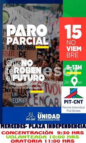 El Plenario Intersindical de Soriano está convocando para una concentración el 15 de noviembre a las 9,30 horas en Plaza Independencia. Sobre las 10 horas se realizará una volanteada, y a las 11 horas se realizará la parte oratoria.