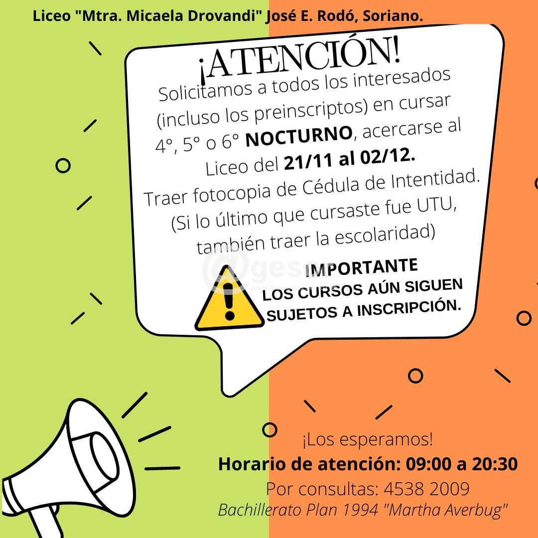 El Liceo “Mtra.Micaela Droandi” de José Enrique Rodó convoca a todos los interesados (incluso los preinscriptos) en cursar 4°, 5° o 6° NOCTURNO, acercarse al Liceo del 2/11 al 02/12/2022.