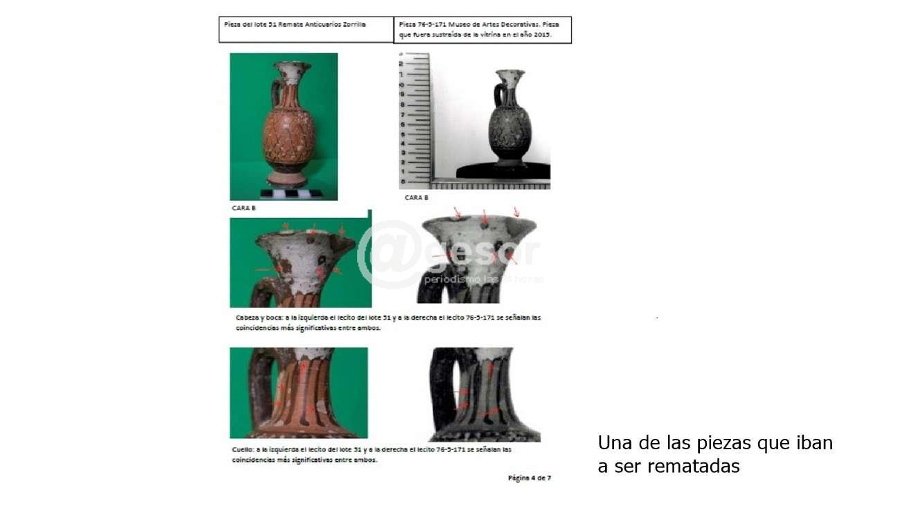 Sobre la pieza sospechada de ser la hurtada en el Museo de Artes Decorativas Palacio Taranco en 2015, se realizaron los estudios pertinentes (medidas, diseños, “marcas” fruto del tiempo/materialidad/uso, etc.) y las correspondientes comparaciones con las imágenes existentes en las bases de datos del museo. Los mismos arrojaron un 100 % de coincidencias. También se constató plenamente que el siglado realizado por el museo en la base de la pieza (para su identificación) había sido deliberadamente borrado, quedando evidencia de ello. Igualmente, se identificó la presencia de pequeños restos del material utilizado por el museo para siglar la pieza. Todo ello indicaba, sin ningún lugar a dudas, que la pieza identificada en el catálogo del remate como “Lekythos Apulian, lote 051” era el “lecito Apulo, identificado como la pieza 76-5-171” del Museo de Artes Decorativas Palacio Taranco. Esta etapa estuvo a cargo del área de conservación de la colección de arqueología del Museo de Artes Decorativas Palacio Taranco. El peritaje e informe correspondiente fue presentado por escrito ante la magistrada actuante.