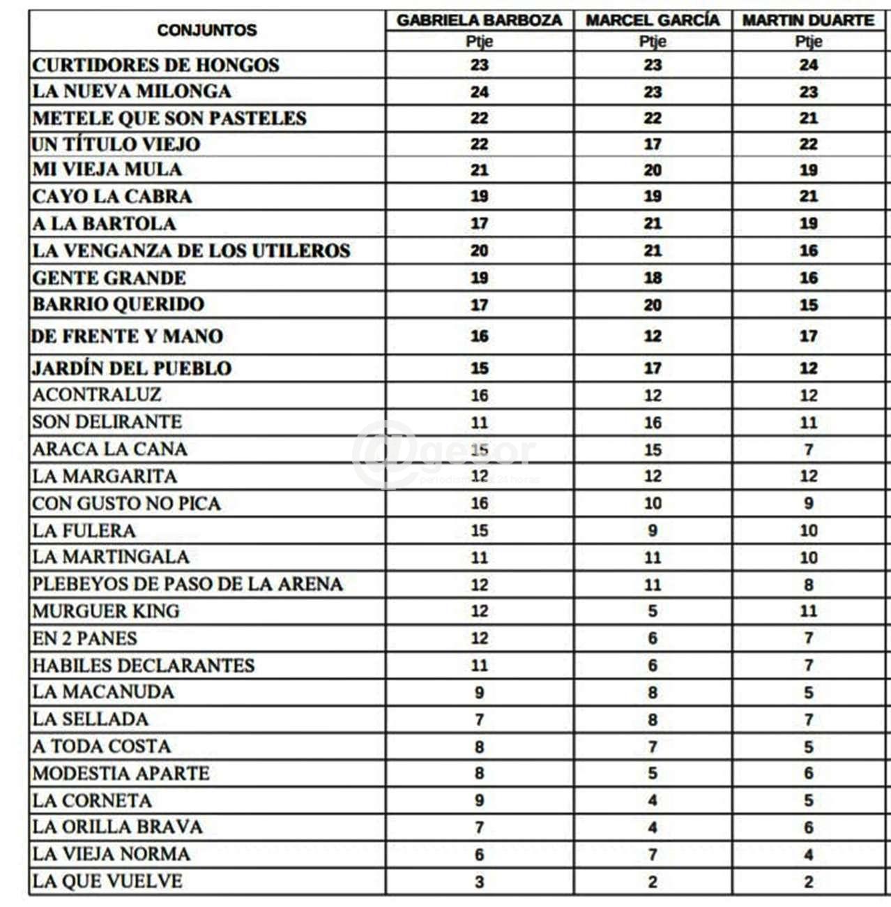 "Con Gusto No Pica" se ubicó a los 17, con 35 puntos, a los 15 estuvo Araca la Cana con 37 y a los 16 La Margarita con 36 puntos, ambas tampoco alcanzaron el puntaje, que en el caso de "Jardín del Pueblo" la última clasificada fue de 44 puntos y las que igualaron en el primer lugar de la prueba fueron Curtidores de Hongos y la Nueva Milonga con 70 puntos.