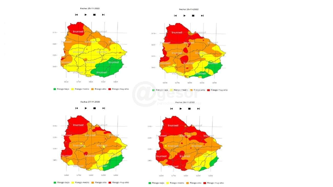 Inumet pronostica lluvias para la jornada del jueves, por lo que podrían traer cierto alivio a la sequía que se viene generalizando en el departamento. Para esta semana el Instituto Uruguayo de Meteorología anuncia temperaturas máximas entre los 27 y 34°, en tanto que la mínima para los próximos días se ubicará cercana a los 19°, con un anuncio de precipitaciones para la mañana del jueves 1 de diciembre. Esto traería algo de alivio al problema de la sequía que se viene extendiendo en el departamento desde por lo menos el 25 de noviembre pasado, con un índice de riesgo de incendio forestal muy alto para esta zona del país. De acuerdo al FWI (Fire Weather Index) índice de riesgo de incendio basado en las observaciones meteorológicas, gran parte del departamento de Soriano se encuentra en rojo, es decir con un riesgo alto, producto de la falta de agua en el suelo y las temperaturas registradas en los últimos días. En la imagen que acompaña esta nota se puede observar esa evolución.