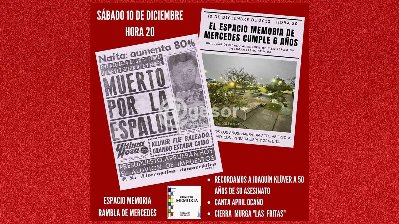 La Comisión Memoria, Justicia, y contra la Impunidad de Soriano organiza para el sábado 10 de diciembre un acto a 50 años del asesinato de Joaquín Klüver. Además será la oportunidad para celebrar el sexto año del Espacio Memoria, que recuerda a los detenidos desaparecidos de Soriano.