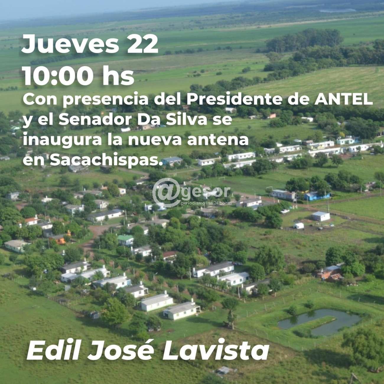Este jueves 22 a las 10.00 horas con presencia del Presidente de Antel, Gabriel Gurméndez estará inaugurándose la nueva torre de comunicaciones del ente en Sacachispas por que redundará en mejor calidad de servicios para los usuarios de esta localidad y zonas aledañas. Junto a Gurméndez llegará el Senador Sebastián Da Silva y ambos estarán acompañados por el Edil José Lavista.
