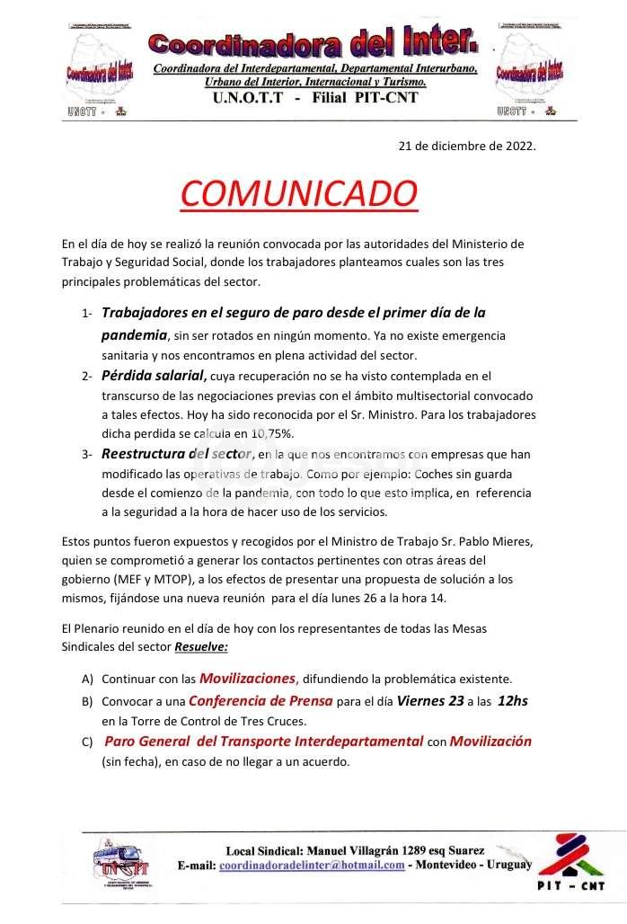 Esta semana se realizó el Plenario de Mesas Directivas de los sindicatos que conforman la Coordinadora (Interdepartamental, Departamental interurbano, Urbano del interior, internacional y Turismo), donde se analizaron los últimos acontecimientos, y ante el anuncio del Poder Ejecutivo de que a partir del 1 de enero 2023 el aumento salarial no contemplaría ningún porcentaje de recuperación de la pérdida sufrida en los últimos meses.