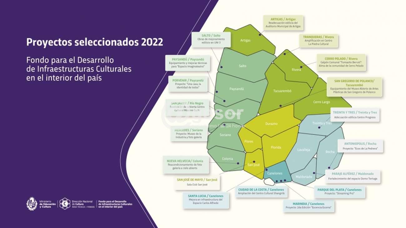 Se difundieron los proyectos seleccionados en la edición 2022 del Fondo para el Desarrollo de Infraestructuras Culturales en el interior del país, otorgando más de $11 000 000 (once millones de pesos uruguayos) para financiar proyectos de reformas, adecuación y mejoramiento edilicia así como equipamiento de los espacios culturales.