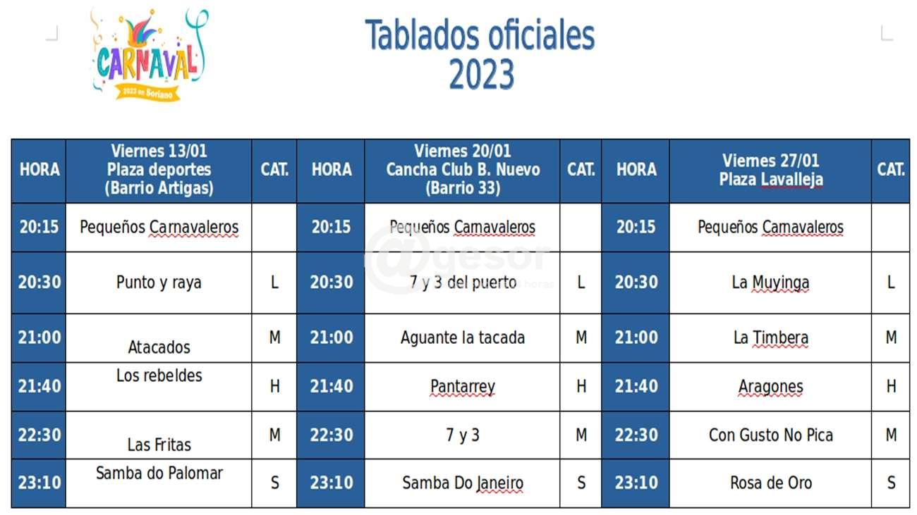Este viernes comienzan los Tablados Oficiales del Carnaval de Soriano 2023, con la realización del primero de ellos en la plaza de Deportes del barrio Artigas, desde la hora 20:15.