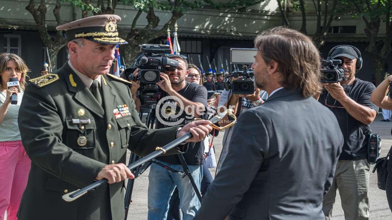Durante la ceremonia, el ministro de Defensa impuso en su cargo al Gral. de Ejército Stevenazzi y el presidente Lacalle Pou, le hizo entrega del sable réplica del perteneciente al Gral. Artigas.