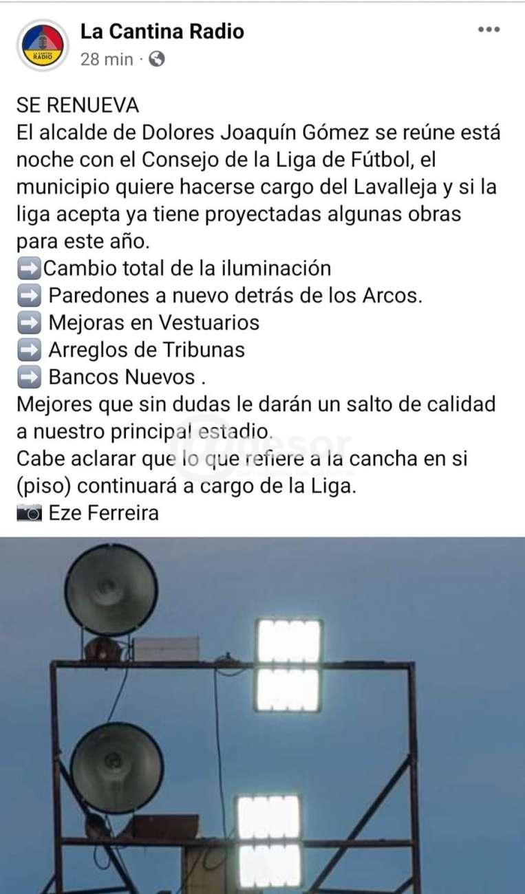 Con todo respeto a las personas que hacen La Cantina Radio en Dolores, aclaramos que votamos 3 millones de pesos (1 millón por año 22-23 y 24) en la Junta Departamental de Soriano para obras en el Parque Lavalleja de Dolores, el dinero está y se tienen que ejecutar, históricamente la Intendencia de Soriano como tiene que ser ha puesto dinero para el Lavalleja, nosotros lo aprobamos muy contentos en la JDS. Es imposible que la liga se niegue a estas mejoras que son para un bien común de todos los futboleros y ya se sabe desde que votamos el presupuesto que se tienen que llevar adelante. Es más en el 23 y 24 hay un plan de UTE con otras instituciones para mejorar la iluminación de muchos estadios del país donde está incluido nuestro departamento.