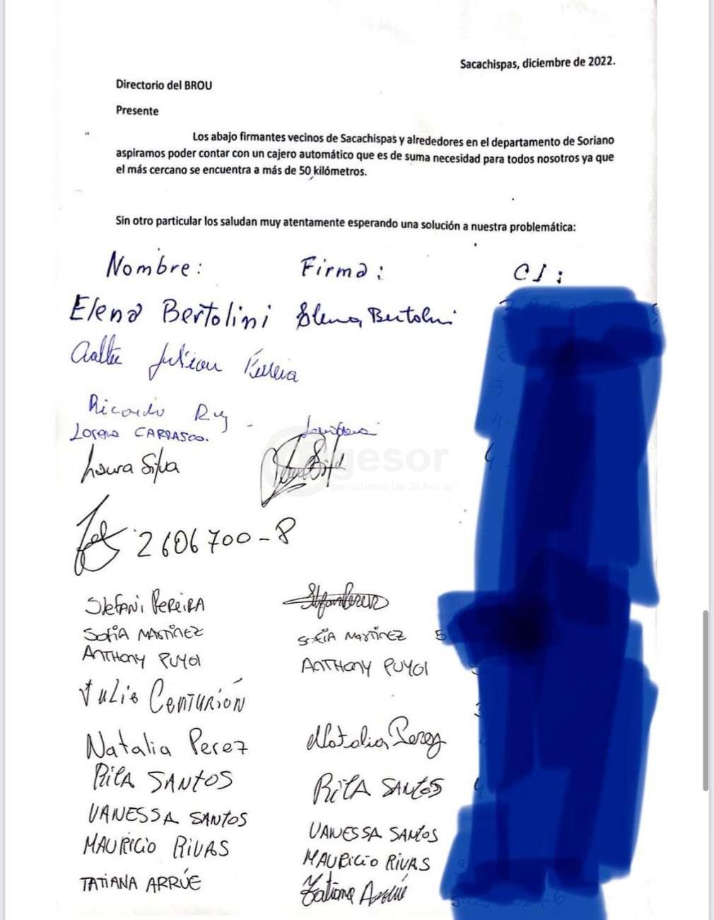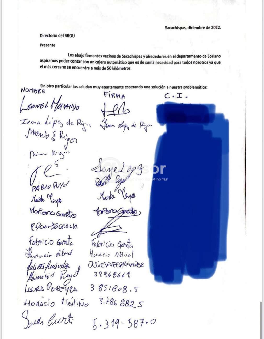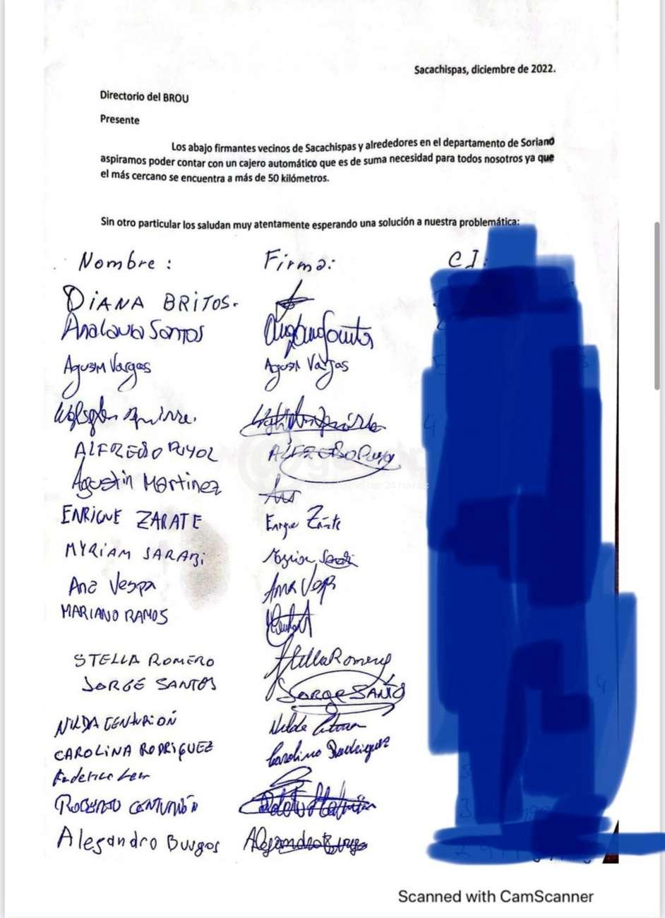 El Edil Luciano Andriolo señaló: "Elevamos a Presidencia del BROU 150 firmas de vecinos de Sacachispas solicitando la instalación de un cajero automático ya que el más cercano está a 50 km.