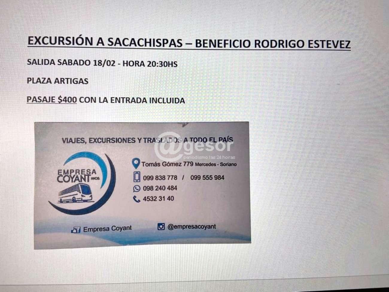 Este sábado a las 20.30 horas parte excursión hacia Sacachispas para participar de beneficio de Rodrigo Estévez, saliendo desde plaza Artigas, con pasaje a $ 400 con la entrada incluida, por parte de la empresa Coyant.