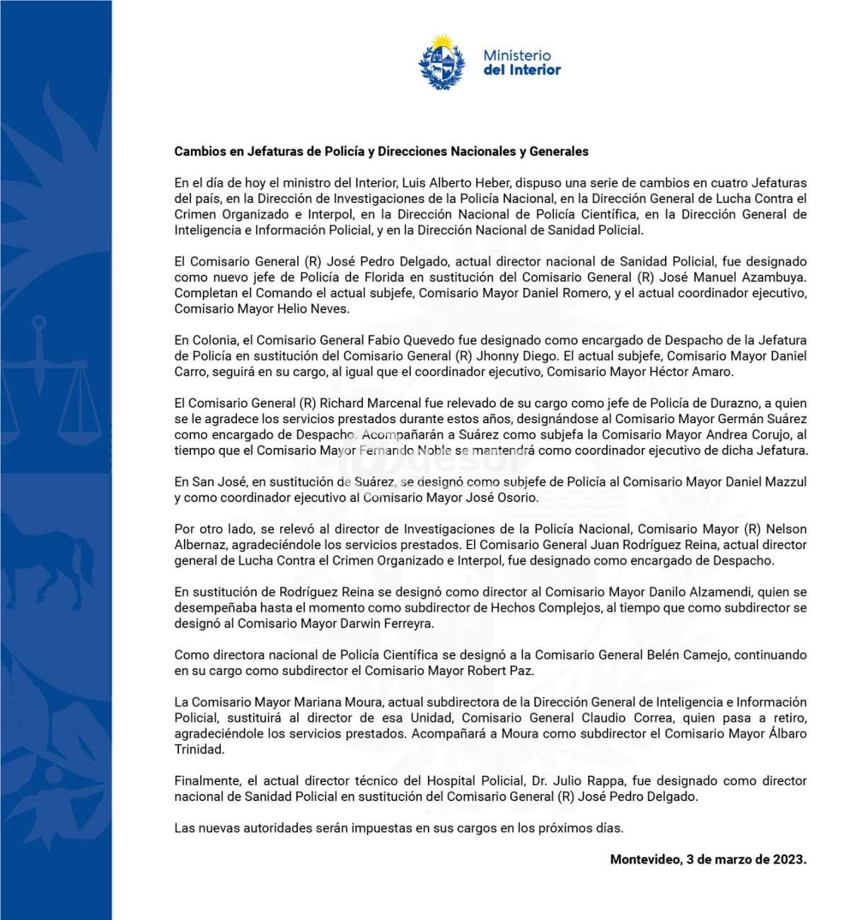 Este viernes el Ministro del Interior, Luis Alberto Heber, dispuso una serie de cambios en cuatro Jefaturas del país en la Dirección de Investigaciones de la Policía Nacional, en la Dirección General de Lucha Contra el Crimen Organizado e Interpol, en la Dirección Nacional de Policía Científica, en la Dirección General de Inteligencia e Información Policial, y en la Dirección Nacional de Sanidad Policial.