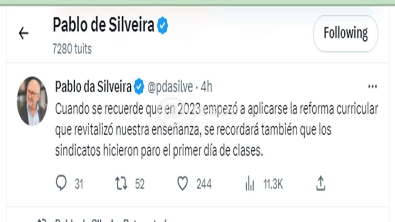 Utilizando la red social Twitter el Ministro de Educación y Cultura expresó su crítica a los sindicatos de Secundaria que anunciaron un paro para el lunes en Montevideo, y un paro de mujeres el 8 de marzo, en todo el país. Palo Da Silveira escribió apenas se conoció la determinación de los sindicatos: “Cuando se recuerde que en 2023 empezó a aplicarse la reforma curricular que revitalizó nuestra enseñanza, se recordará también que los sindicatos hicieron paro el primer día de clases”.