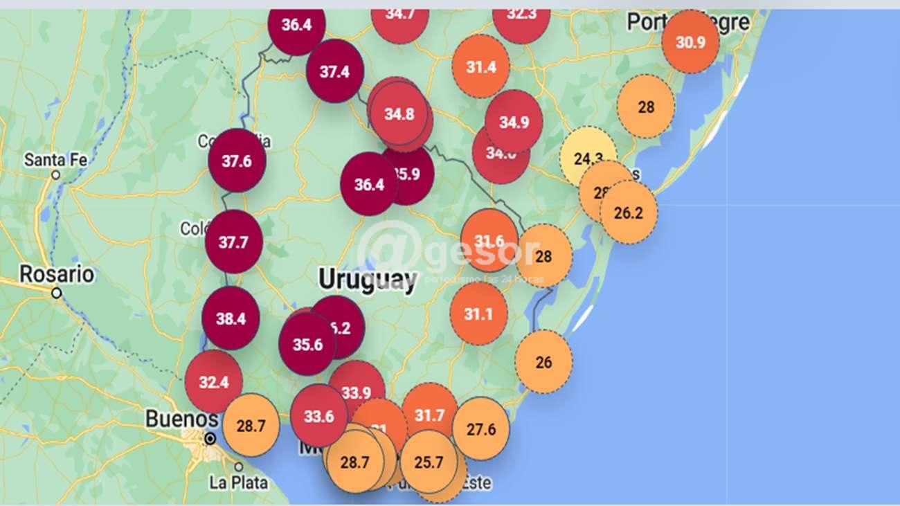 El litoral uruguayo sigue atravesando esta nueva ola de calor, y la ciudad de Mercedes volvió a ubicarse en el punto más alto, en cuanto a temperatura, con 38,4º registrados a las 15 horas del jueves 9 de marzo. Una jornada agobiante que se notó desde antes de que saliera el sol, ya que a las 2 de la madrugada se registraban 25º y trepó rápidamente durante el día con temperaturas que rondaron entre los 22º y los 38,4º.
