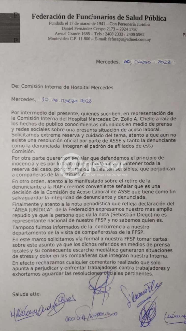 Por intermedio de la presente, quienes suscriben, en representación  de la Comisión  Interna del Hospital Mercedes Dr. Zoilo A. Chelle a raíz de lo hechos de  público conocimiento  difundidos  en medio de prensa  y redes sociales sobre una presunta situación de acoso laboral. Solicitamos extrema reserva  y cuidado del tema, atento a que  aun no existe una resolución oficial por parte de ASSE y tanto la denunciante como la denunciada integran el padrón de  afiliados de esta Comisión.