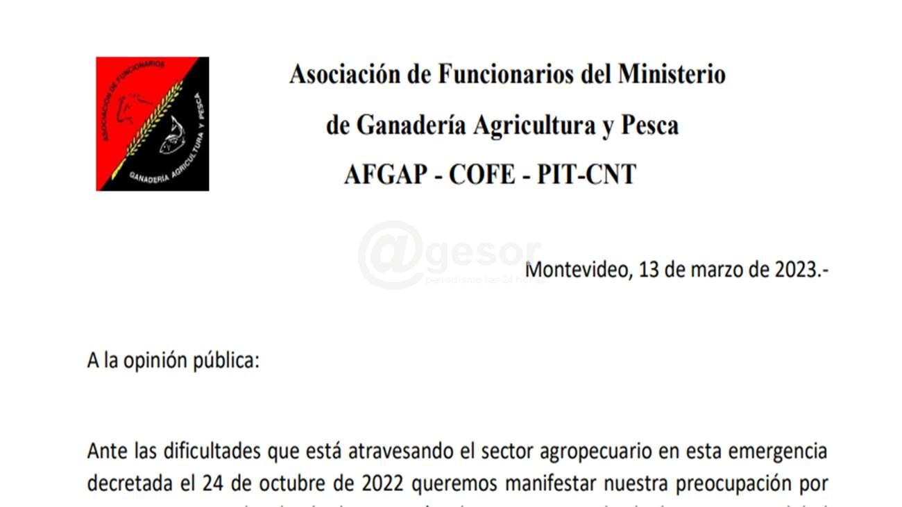 Asociación de Funcionarios del Ministerio de Ganadería, Agricultura y Pesca (AFGAP) expresó su preocupación por la problemática que viene atravesando el sector, producto de la sequía, cuestionando las medidas que ha implementado el gobierno. “Hoy más que nunca necesitamos un Estado presente y comprometido que brinde políticas públicas que den soluciones en tiempo y forma en su rol irrenunciable de amortiguador de las desigualdades”, expresan en un comunicado que reproducimos a continuación.