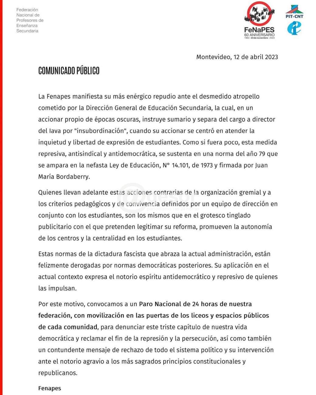 La Fenapes manifiesta su más enérgico repudio ante el desmedido atropello cometido por la Dirección General de Educación Secundaria, la cual, en un accionar propio de épocas oscuras, instruye sumario y separa del cargo a director del Iava por "insubordinación", cuando su accionar se centró en atender la inquietud y libertad de expresión de estudiantes. Como si fuera poco, esta medida represiva, antisindical y antidemocrática, se sustenta en una norma del año 79 que se ampara en la nefasta Ley de Educación, Nº 14.101, de 1973 y firmada por Juan María Bordaberry.