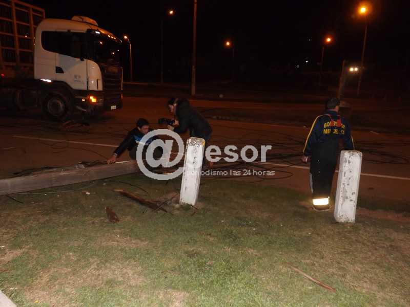 @gesor en contacto con uno de los trabajadores de la Estación Ancap de Mario Echenique (que pudo ver como transcurría el accidente), manifestó a nuestra Agencia de Noticias que próximo a las 17:00 horas la linga que cruzaba de este a oeste y que unía el predio del Hogar de Ancianos con el de Acodike, de manera repentina bajó de altura y ello fue provocando que una cantidad importante de camiones fueran enganchando de a uno los cables que parecían venirse abajo, tal como sucedió sobre las 20:00 horas. Según declaraciones del pistero de la estación de servicio, dada la situación que se venía observando, se avisó en más de una oportunidad a las autoridades que podían tener competencia en el asunto, aunque nadie se acercó hasta el lugar para subsanar el inconveniente que terminó agravándose cuando la linga, los cables y la columna de madera fueron literalmente arrancados .