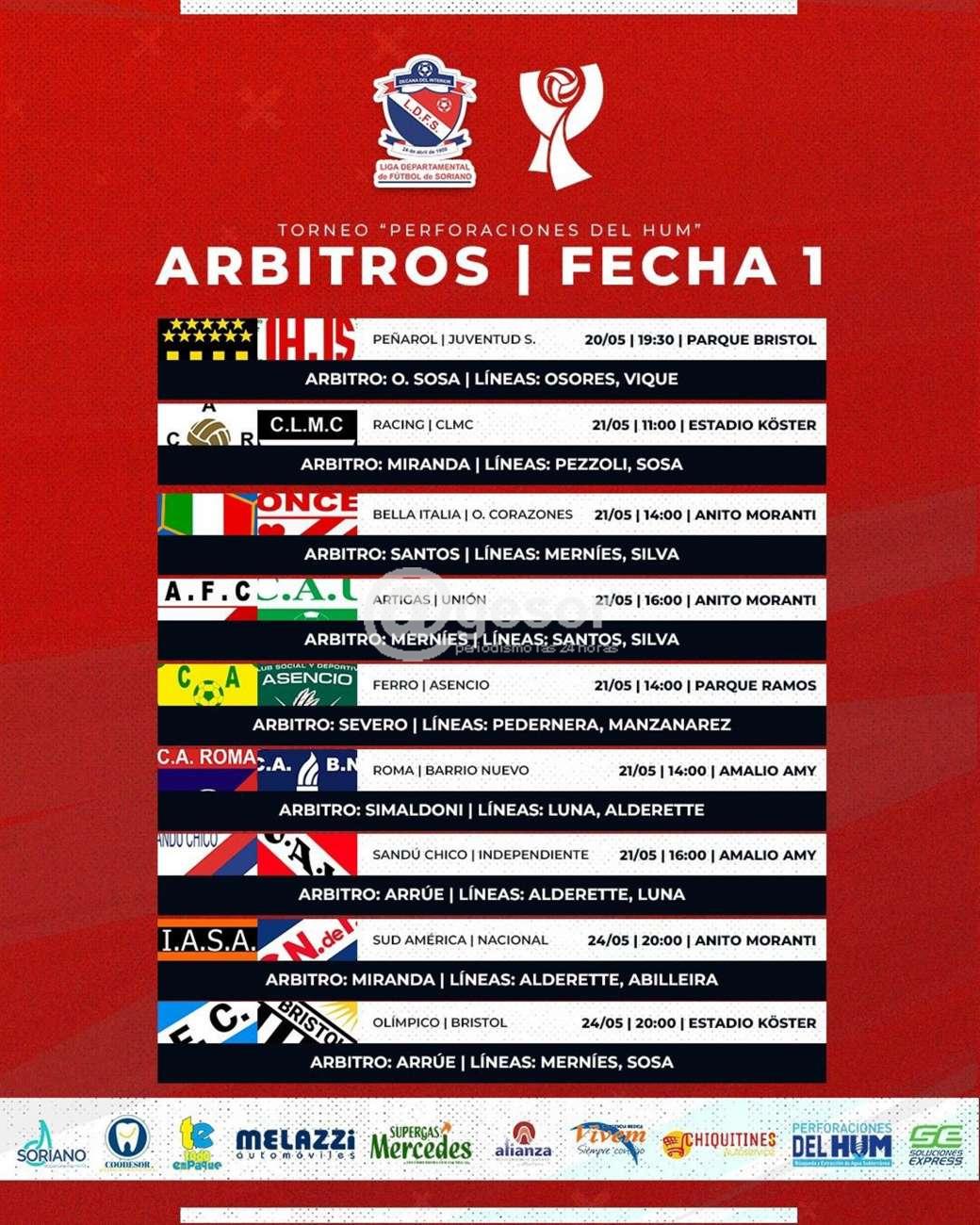 El Colergio de Arbitros de la Liga Departamental de Fútbol de Soriano realizó las designaciones de las ternas arbitrales que estarán conduciendo los encuentros correspondientes a la primera fecha del Torneo Integración "Perforaciones del Hum" en primera división, que estará jugándose durante tres días, comenzando este sábado en el parque Bristol a las 19.30 horas con el partido entre Peñarol y Juventud Soriano, continuará durante el domingo 21 con un juego a las 11.00 en el estadio "Köster" para la televisión entre Racing y CLMC, otros irán por la tarde y se completará el miércoles 24 con los encuentros Sud América - Nacional a las 20.00 en el "Anito Moranti" y en el "Köster" a las 20.00 Olímpico - Bristol, ello debido a la participación de Nacional y Bristol en el torneo de clubes de OFI.