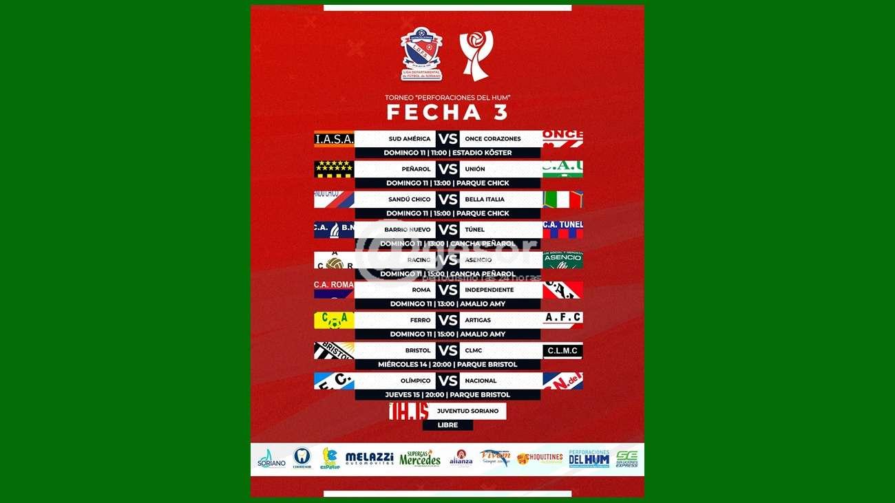 Completan la 3era fecha los encuentros entre Bristol-CLMC en Parque Bristol, el miércoles 14, a las 20 horas; y Olímpico-Nacional, en la misma cancha y horario, el jueves 14 de junio. Tiene fecha libre Juventud Soriano.