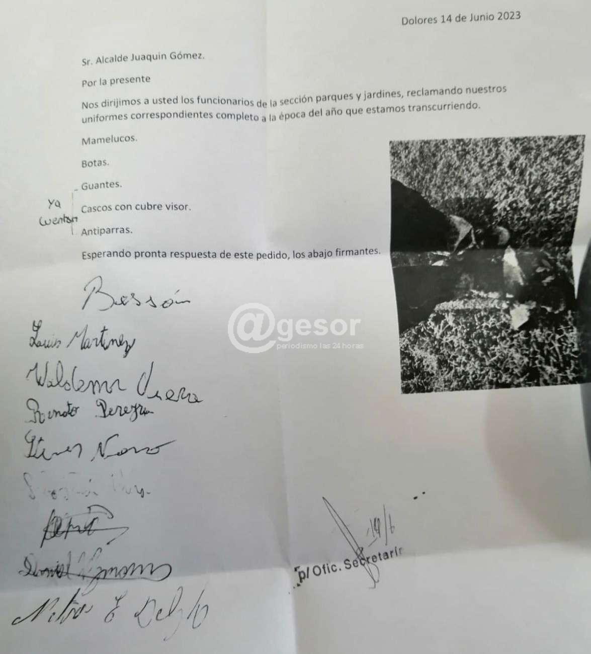1) Para los funcionarios de Parques y Jardines pedimos los uniformes correspondientes completos para esta época del año principalmente botas de gomas y mamelucos, ellos también presentaron una carta firmada con esta solicitud.