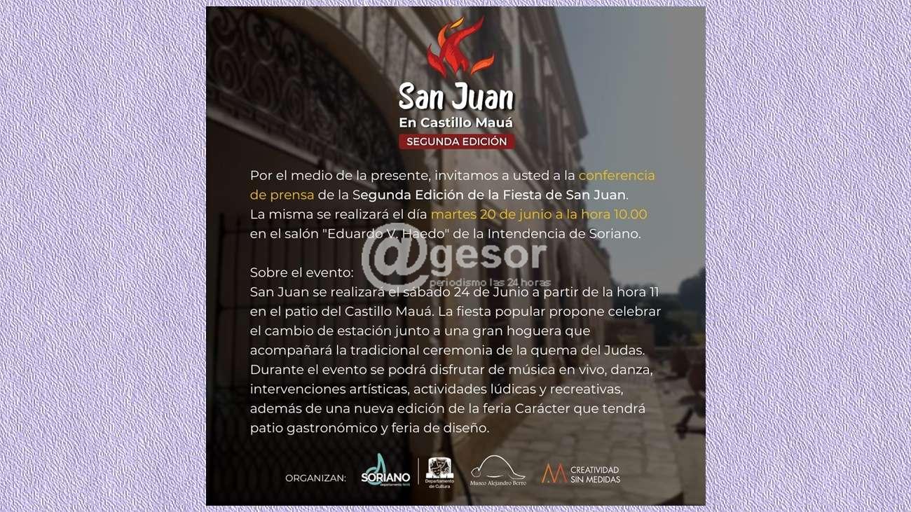 El martes 24 junio se realizará el lanzamiento de la segunda ediciòn de la Fiesta de San Juan. La actividad es organizada por la Intendencia de Soriano, y se desarrollará el sàbado 24 de juio en el patio del Castillo Mauá.